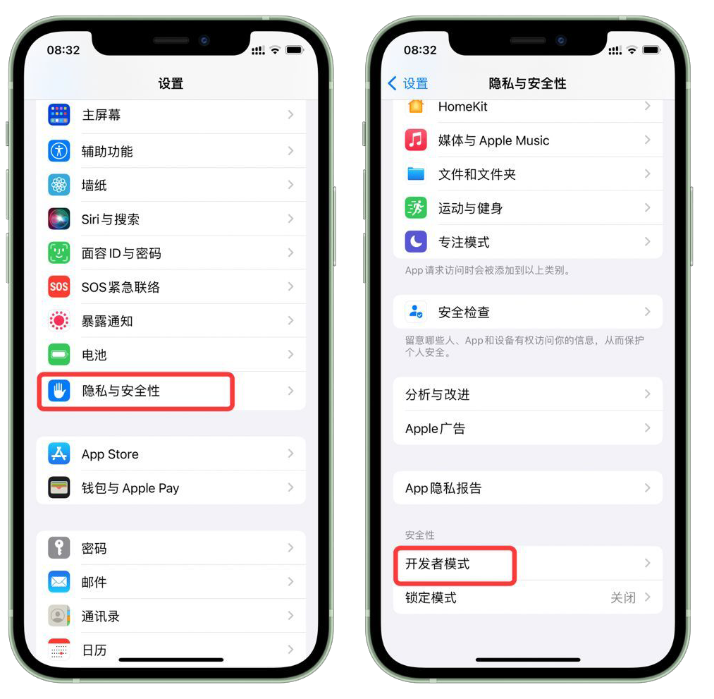 然后在设备中点击【设置>>隐私与安全性>>开发者模式】,开启开发者模式,然后提示重启手机,点击重新启动